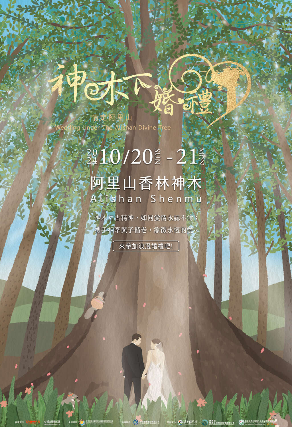 2024阿里山神木下婚禮在交通部觀光署方正光主任秘書等人的祝福下於113年10月20至21日在阿里山國家森林遊樂區香林神木平台完成盛大儀式。阿里山千年神木及今年獨有的鄒族文化體驗,為新人打造出獨一無二且富有儀式感的森林系婚禮,並在證婚人阿里山國家風景區管理處洪維新處長、阿里山鄉公所高瑞芳鄉長、觀光署吳潔萍組長、農業部林業及自然保育署嘉義分署鄭鈞騰秘書及與會在地村長與公協會、社區協會理事長及媒體先進等貴賓及親屬共同見證下,獻上最深的祝福。