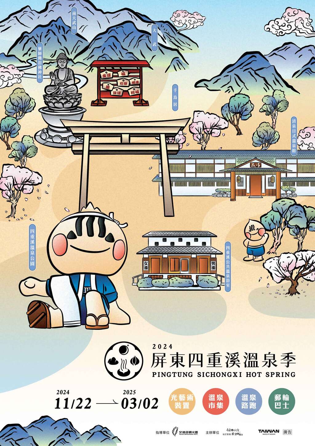 訊息內容屏東縣政府訂於113年11月22日至114年3月2日於屏東縣車城鄉及牡丹鄉舉辦「2024屏東四重溪溫泉季」活動,活動期間特別展示光藝術裝置、溫泉市集、溫泉路跑及郵輪巴士等,藉此推動鄰近地區溫泉觀光發展,歡迎大家共襄盛舉。相關連結 活動官方網站 相關照片 上一則 回列表 下一則