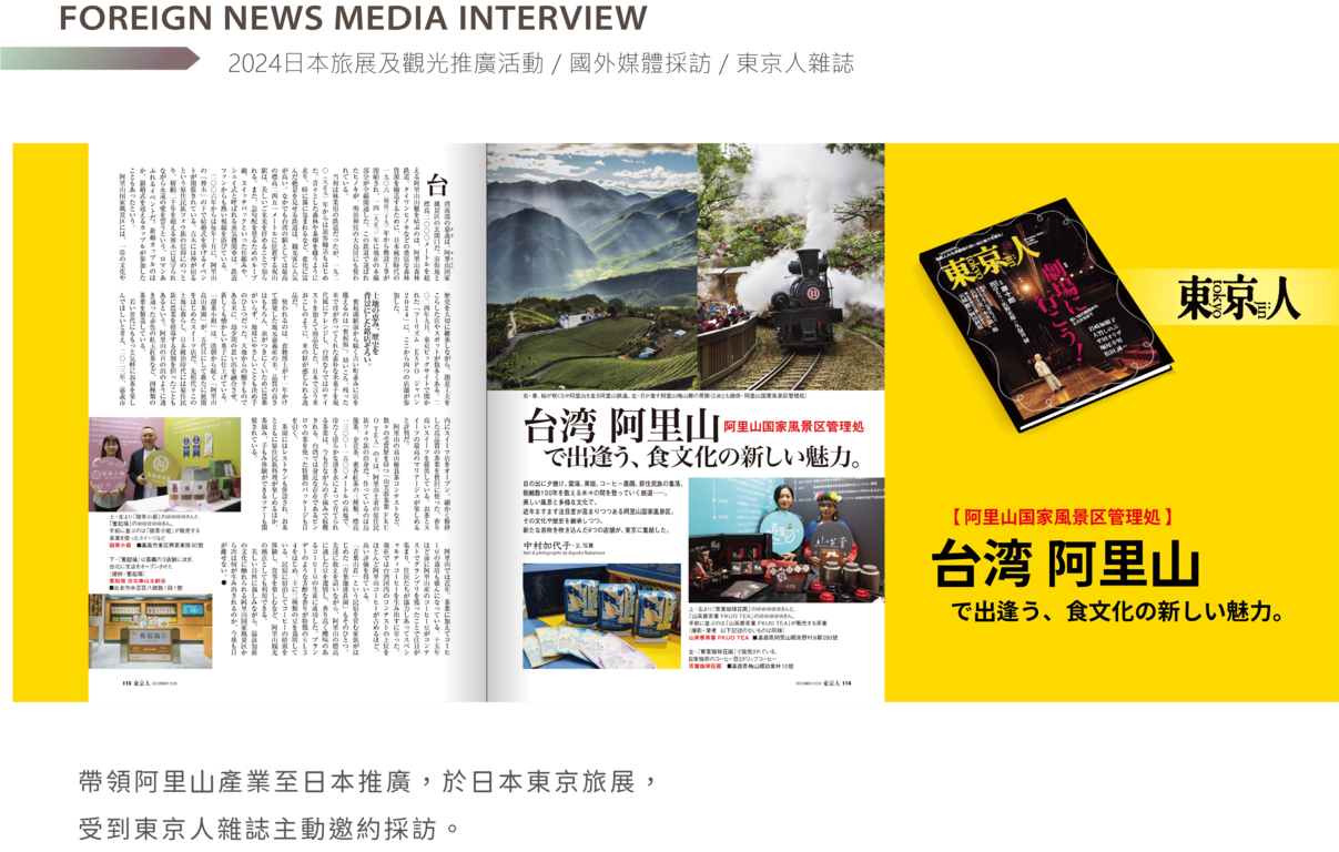 阿里山管理處今年在旅展因緣際會下受到《東京人》雜誌青睞,雜誌社主動邀訪規劃專題,希望以日本視角介紹他們眼中獨具魅力的台灣阿里山。創立於1986年的《東京人》發行量達3萬5千本,貫以從傳統文化到潮流風尚,探討城市文化的多樣面貌。這次阿里山的專題報導將在《東京人》2025年1月號雜誌刊登,刊物預計在今年12月3日發行,包含紀伊國屋書店、樂天Kobo電子書、亞馬遜網路書店等實體及線上通路都能購買,這也是對阿里山觀光產業的強心針與一大肯定。