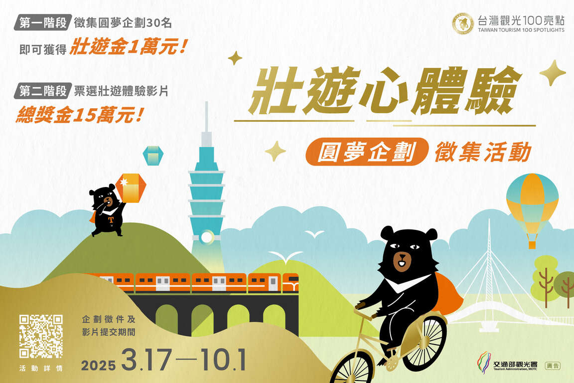 一、觀光署攜手全臺22個縣市與各國家風景區管理處,推動「台灣觀光100亮點」,刻正委託天下雜誌股份有限公司舉辦「台灣觀光100亮點—壯遊心體驗」圓夢企劃徵集活動,邀請全國民眾規劃動人且深刻的壯遊旅程,以永續旅遊概念,旅行「台灣觀光100亮點」及周邊景點;114年5月11日前投稿壯遊體驗企劃,就有機會獲得壯遊金新臺幣(下同)1萬元,完成壯遊圓夢之旅,拍攝壯遊影音最高可再獲得獎金5萬元。
