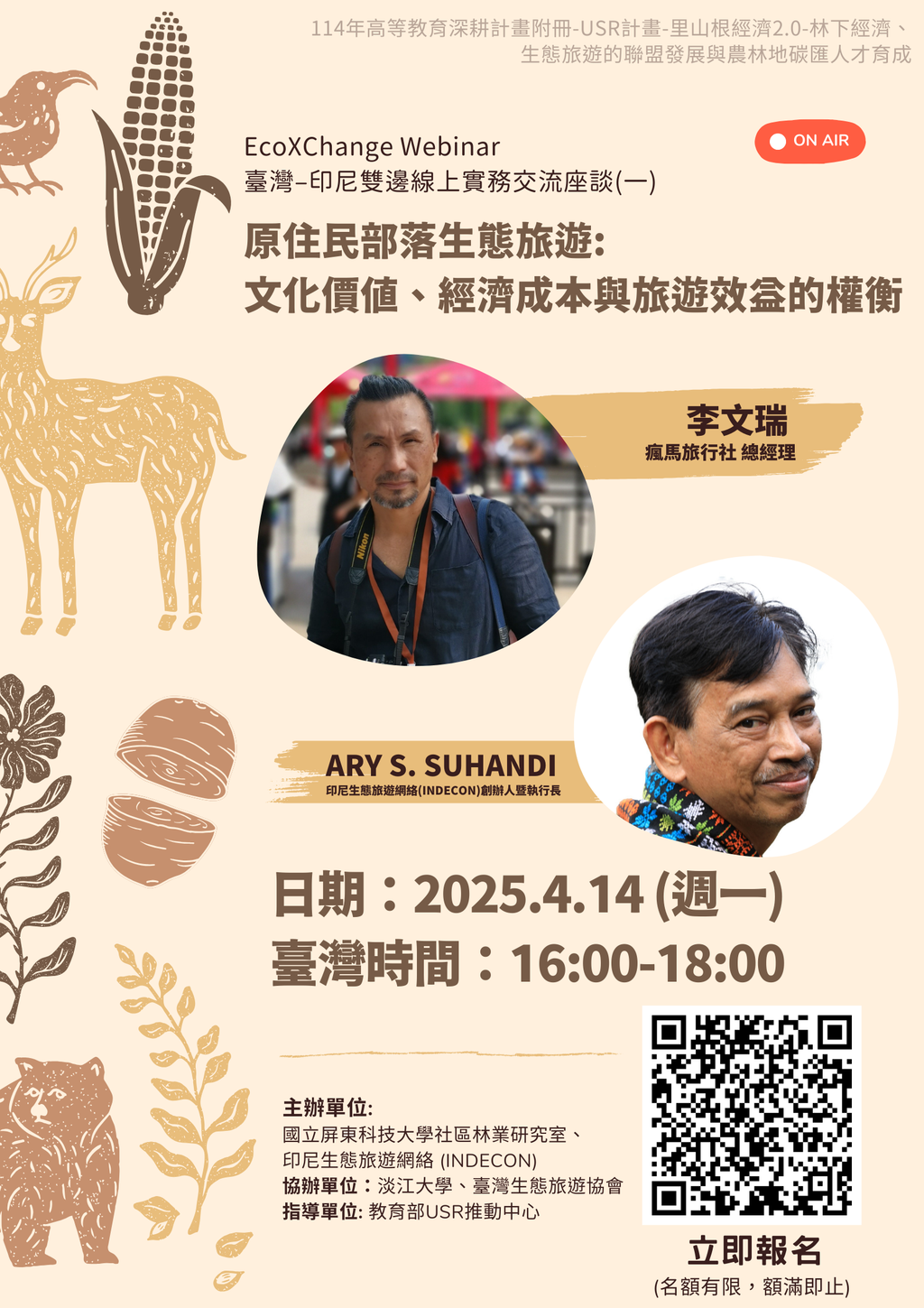 一、國立屏東科技大學森林系社區林業研究團隊與臺灣生態旅遊協會自 2024 年起,與印尼生態旅遊網絡(INDECON)建立緊密的交流合作關係。同年更共同促成「臺灣生態旅遊與地方創生聯盟(TERRA)」的成立,集合國內65個生態旅遊社區,朝向區域串聯發展的DMO經營模式。為拓展臺灣夥伴的國際視野,推動橫跨國界的里山根經濟網絡,深化永續發展與地方創生的實踐,團隊將定期辦理線上座談會,連結臺灣和印尼的生態旅遊網絡平台,共同促進生態旅遊DMO的發展,特邀請貴單位參與。