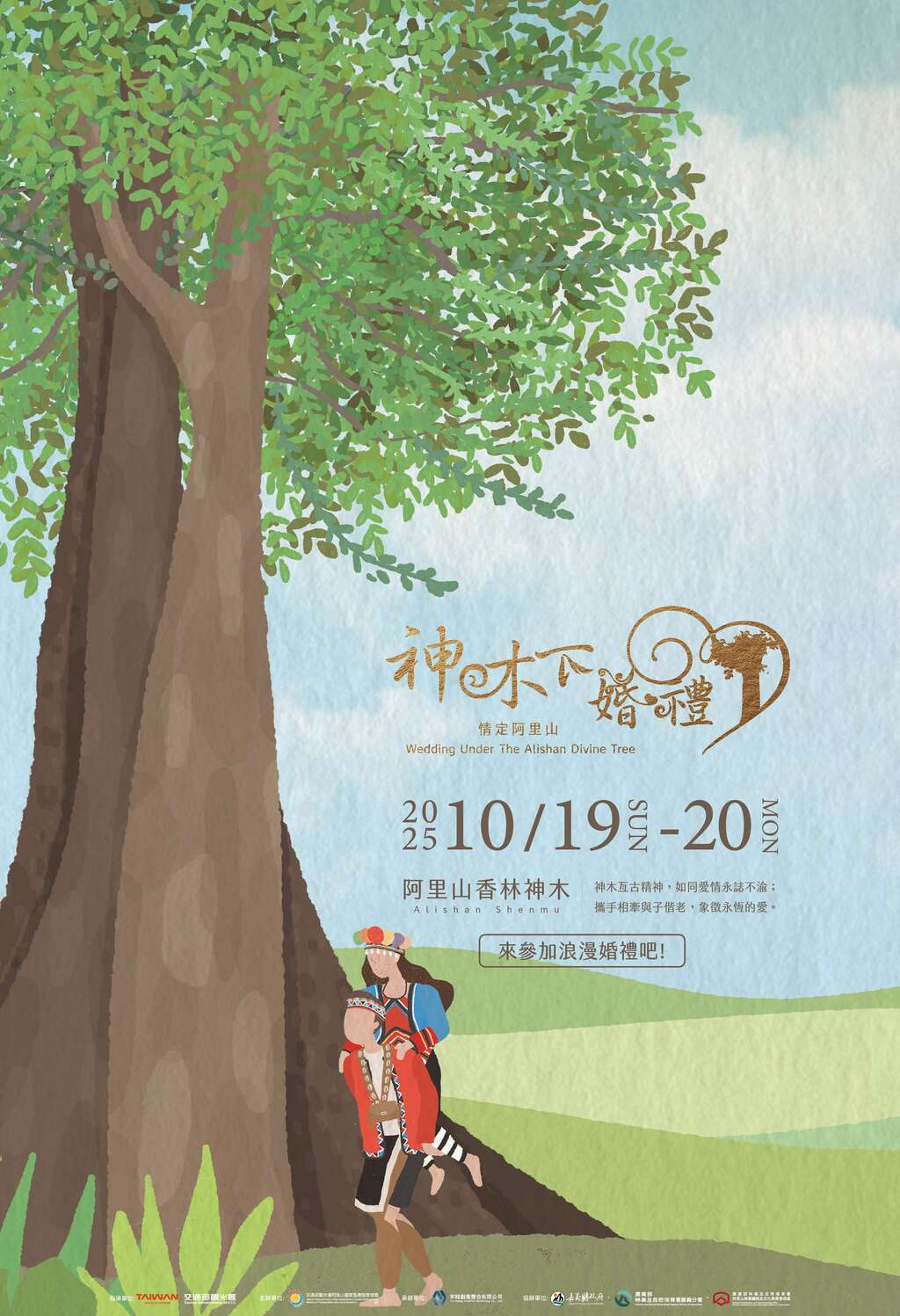 2025阿里山神木下婚禮將於114年10月19-20日於阿里山香林神木平台盛大舉行,只要13,140(愛你一生一世)元的報名費,新人就能擁有森林中的證婚儀式、鄒族婚禮體驗、婚紗拍攝及阿里山賓館專屬喜宴等,為您打造專屬婚禮旅程,在千年神木下見證彼此的諾言,讓愛不只是感覺,而是銘刻心底的永恆回憶。