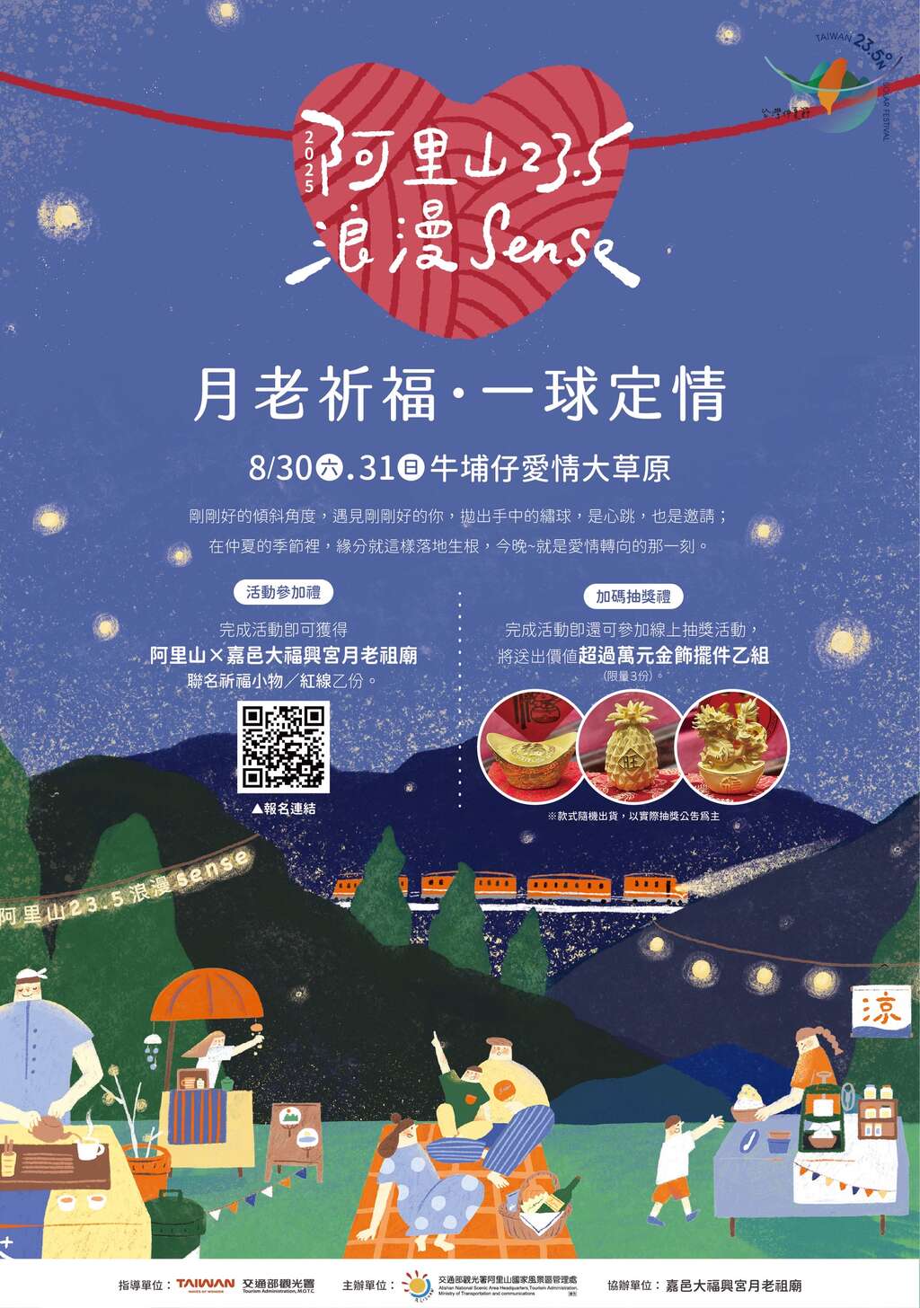 七夕將至,愛情的氣息在山林間悄然蔓延。今年夏天,由交通部觀光署阿里山國家風景區管理處(以下簡稱阿里山管理處)主辦的年度品牌活動「阿里山23.5浪漫Sense」,特別與嘉義在地信仰中心嘉邑大福興宮月老祖廟攜手推出全新聯名企劃—「月老祈福.一球定情」活動,將傳統民俗注入創意觀光,打造一場跨越時空、甜蜜升溫的戀愛盛事!
