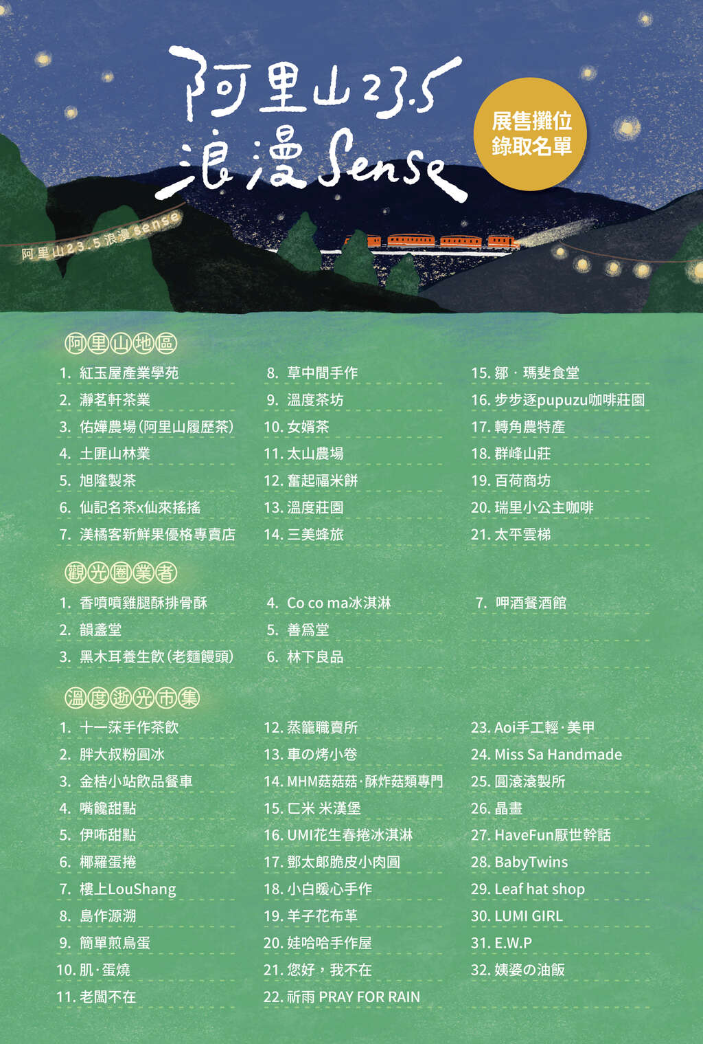 訊息內容阿里山23.5º浪漫Sense ⭔ 溫度市集 當阿里山遇見 @溫度逝光.Market ,與市集品牌同策浪漫✨ 活動日期▸114.8.30(六) – 8.31(日) 活動時間▸15:00–21:00 活動地點▸牛埔仔愛情大草原 (嘉義縣番路鄉觸口橋12號) 阿里山在地產業與觀光圈業者及溫度逝光市集錄取名單: 相關照片 上一則 回列表 下一則