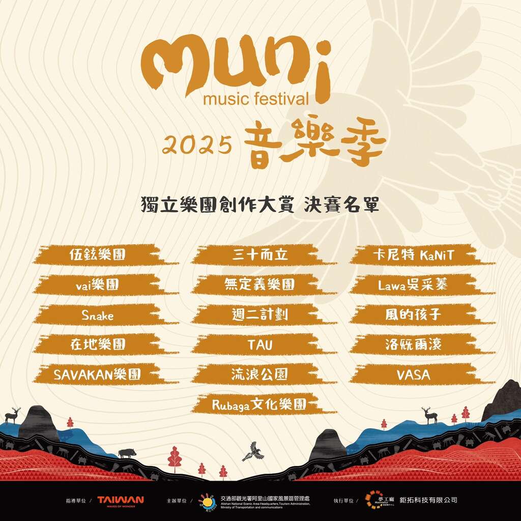 訊息內容2025阿里山muni音樂季「獨立樂團創作大賞」決賽名單揭曉! 伍鉉樂團/vai樂團/Snake/在地樂團/SAVAKAN樂團 三十而立/無定義樂團/週二計劃/TAU 流浪公園/卡尼特 KaNiT/Lawa吳采蓁 風的孩子/洛兓爾滾/VASA/Rubaga文化樂團 相關照片 上一則 回列表 下一則