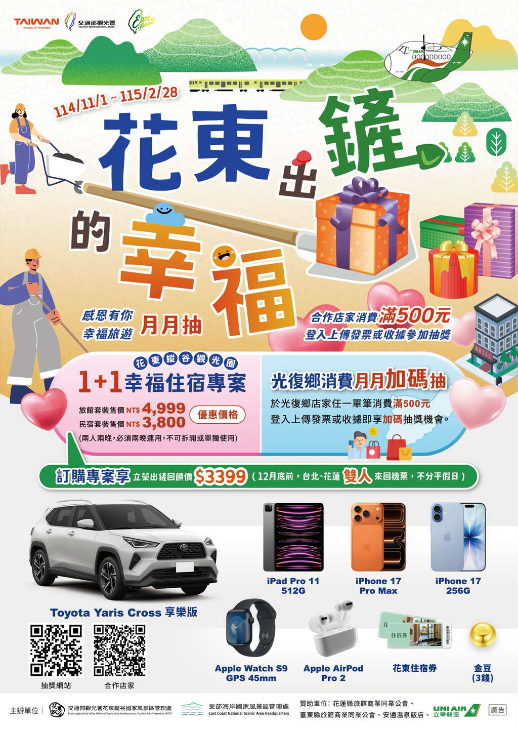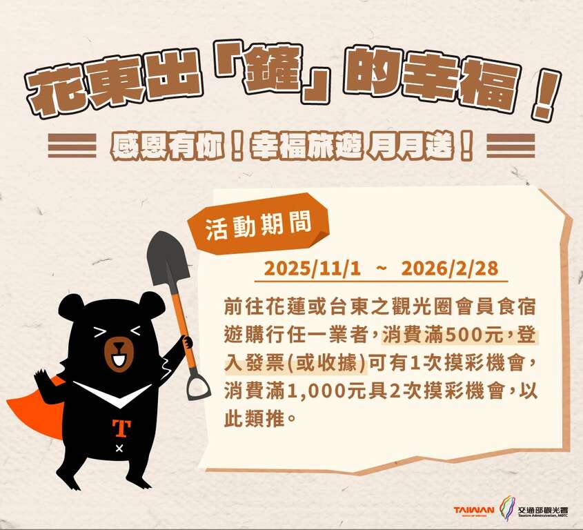 為了讓旅程驚喜再升級,同步推出「花東出『鏟』的幸福!感恩有你!月月送」抽獎活動。活動期間自114年11月1日至115年2月28日止,凡於東區觀光圈 East of Taiwan 合作業者(食、宿、遊、購、行)消費滿500元,即可登錄發票參加抽獎;滿1,000元可享雙倍中獎機會。每月均有住宿券、3C產品及花東大禮包等多項好禮;此外,於光復鄉消費的旅客,更可參加加碼抽獎,有機會獲得iPhone 17與台糖住宿券各1名。活動最終再加碼的「鏟出幸福獎」將送出Toyota Yaris Cross汽車、金豆及多項驚喜大獎,讓旅途幸福滿載,驚喜不斷。
