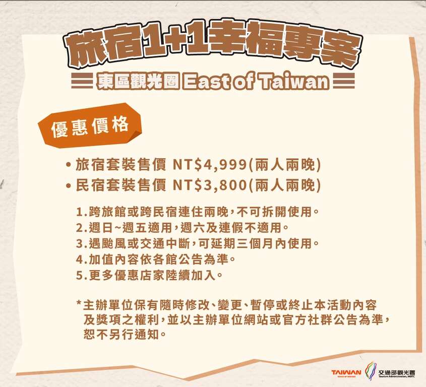 「1+1幸福專案」以跨旅館或跨民宿的兩晚優惠組合為主打,讓旅客能彈性選擇住宿,輕鬆規劃花東旅程。活動自114年11月1日起至115年2月28日止,推出兩種方案,旅館套裝兩人兩晚優惠價新台幣4,999元,民宿套裝兩人兩晚優惠價新台幣3,800元,立榮航空更加碼「出鏟回饋價」搭配住宿專安享台北-花蓮「雙人」來回機票3,399元(12月底前,不分平假日);有關各旅館適用日期與規範略有不同,旅客可於訂房前確認相關內容。若遇颱風、交通中斷等不可抗力因素,第二晚可於三個月內延期使用,設計貼心又具彈性。此外,部分配合業者更結合餐飲、體驗、文創與農特產品等加值內容,讓旅客以實惠價格享受高品質住宿與在地體驗,三天兩夜的總價值遠超售價,實實在在回饋前來花東的朋友。