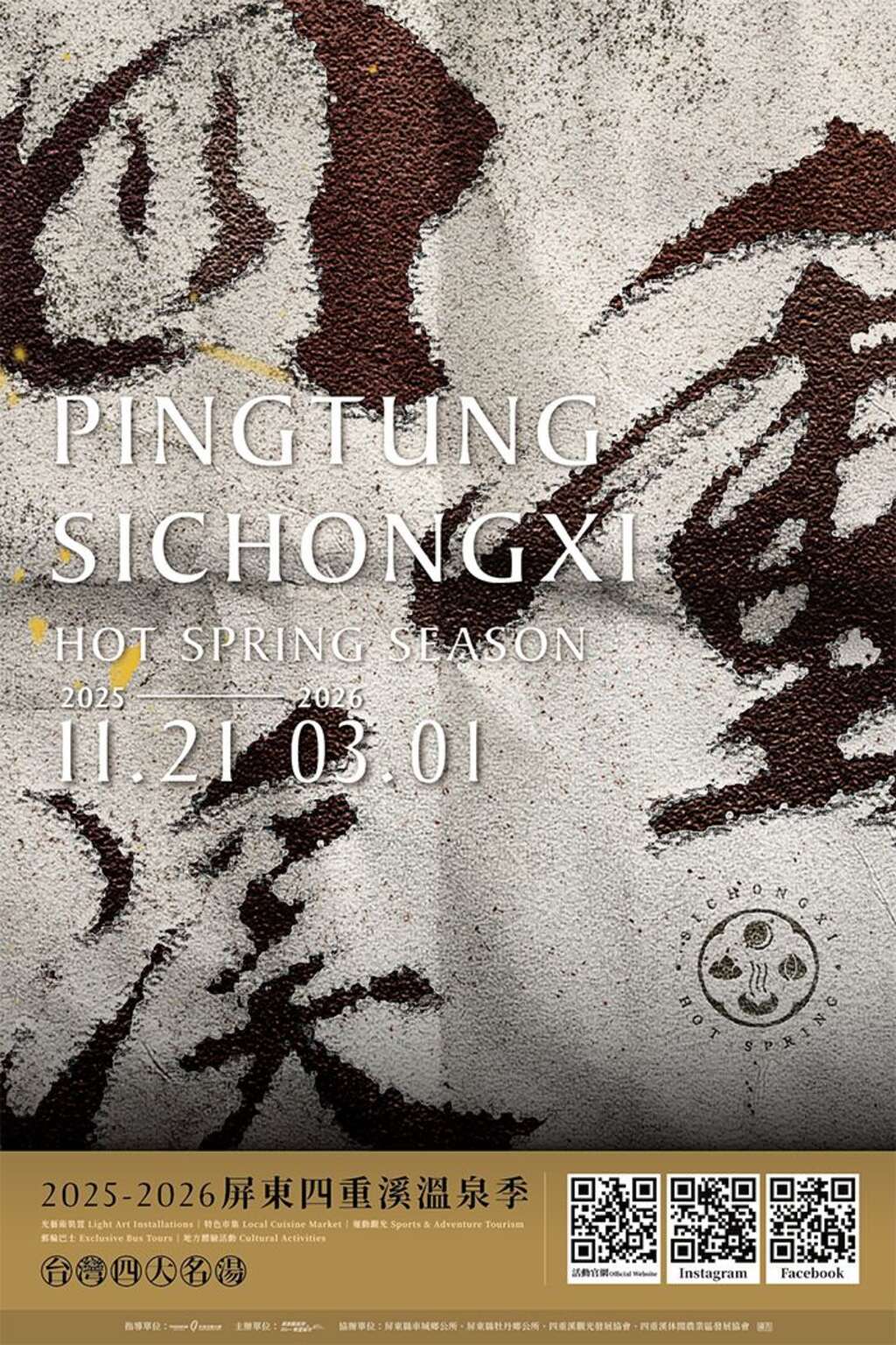 訊息內容屏東縣政府訂於114年11月21日至115年3月1日於屏東縣車城鄉及牡丹鄉舉辦「2025-2026屏東四重溪溫泉季」活動,活動期間特別展示光藝術裝置、溫泉市集、溫泉路跑、溫泉自行車、郵輪巴士及地方體驗等活動,藉此推動鄰近地區溫泉觀光發展。相關連結 活動官方網站 相關照片 上一則 回列表 下一則