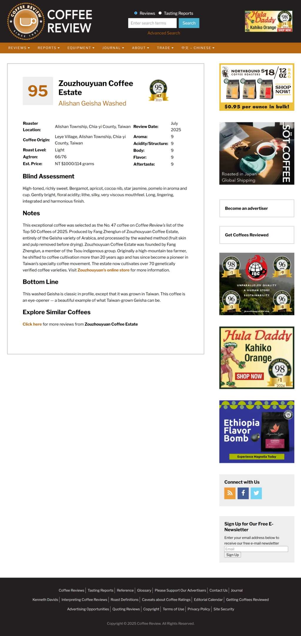 阿里山精品咖啡登上國際舞台 鄒築園Geisha榮獲Coffee Review Top50 阿里山管理處攜手三大莊園前進 2025首爾國際咖啡展