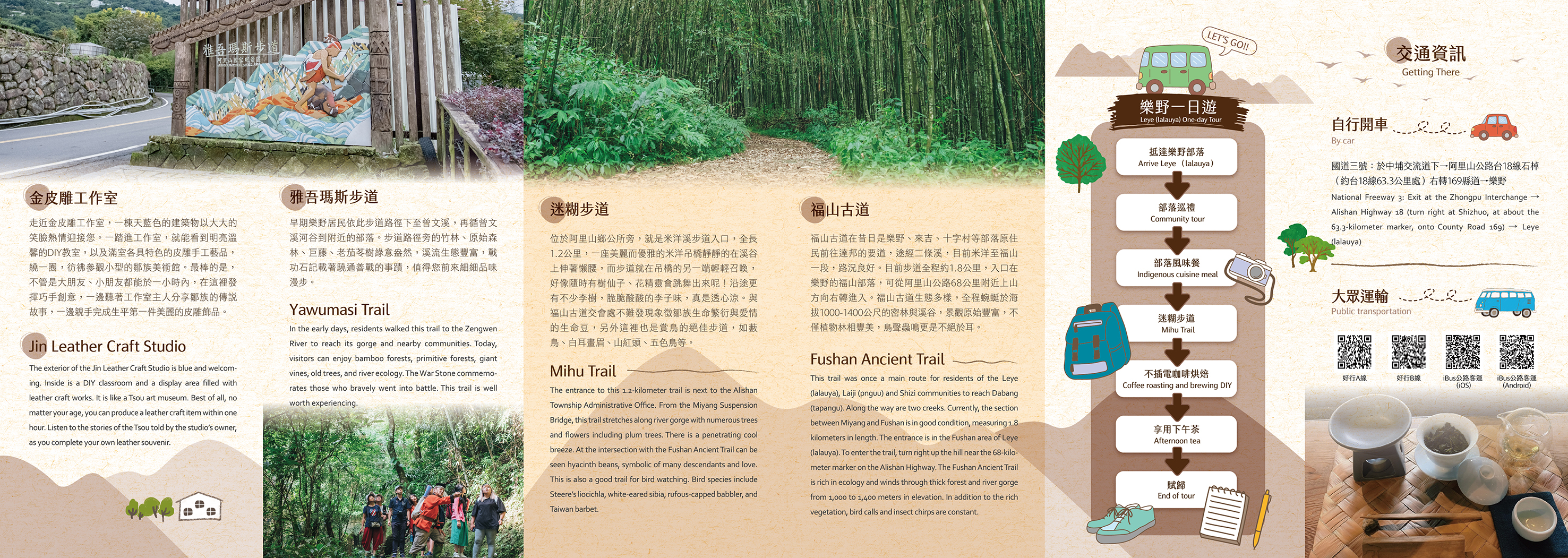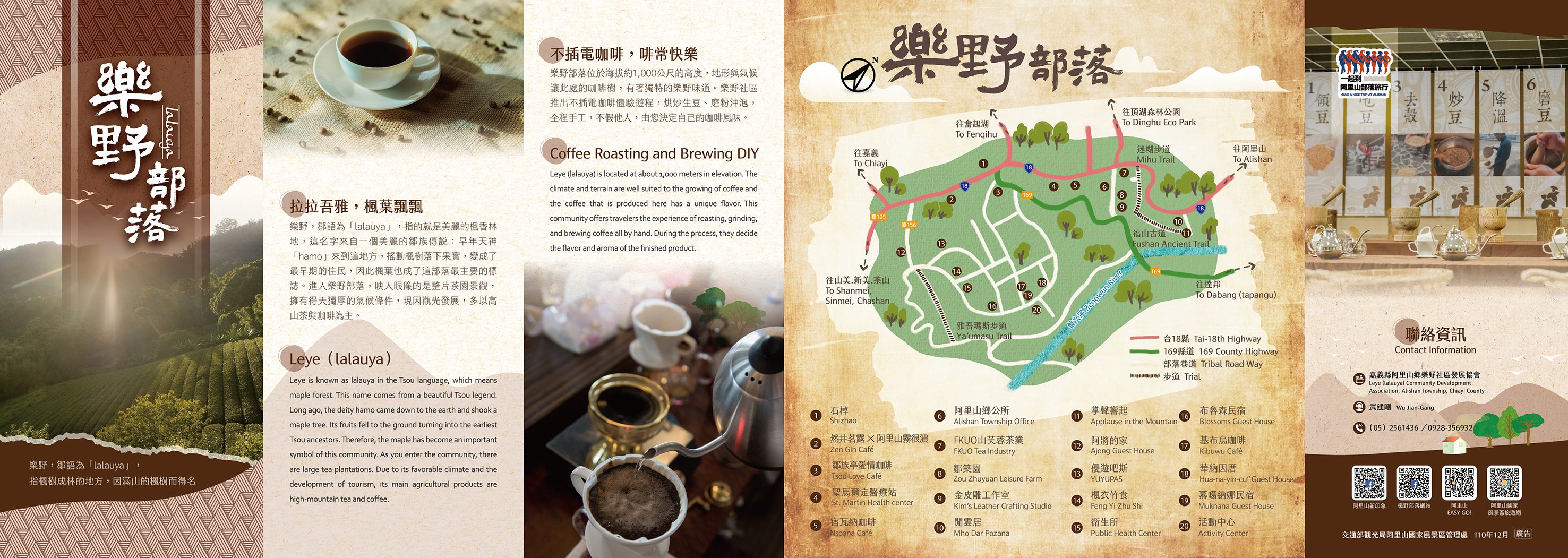 - 鄒族部落旅遊阿里山-樂野部落發行單位: 阿里山國家風景區管理處 類別: 鄒族部落旅遊內容:樂野,鄒語為「Lalauya」,指楓樹成林的地方,因滿山的楓樹而得名。